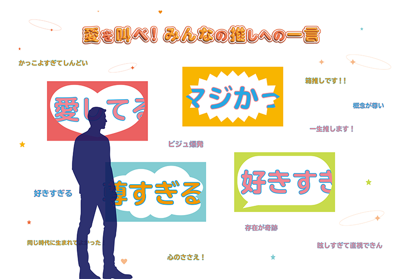 推しへの想いを手元のスマホで入力すると、その想いが大きな画面に表示され、来場されたみなさんの推しへの愛の集積をみることができます。
