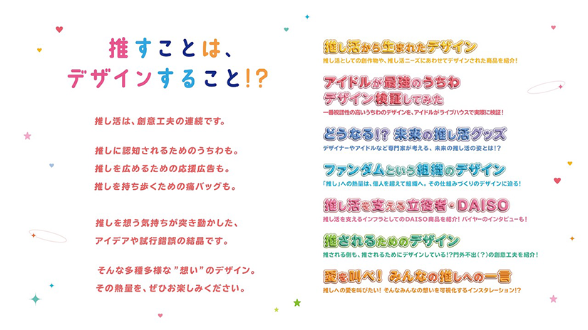 ライブに持参する自作のうちわ、推しの缶バッジを大量に装飾したバッグである「痛バッグ(痛バ)」、推しのグッズを飾りつける「祭壇」など、推し活が生んだデザインを実物で紹介するコーナーから、実際のアイドルとコラボしたコンテンツなど盛りだくさん。